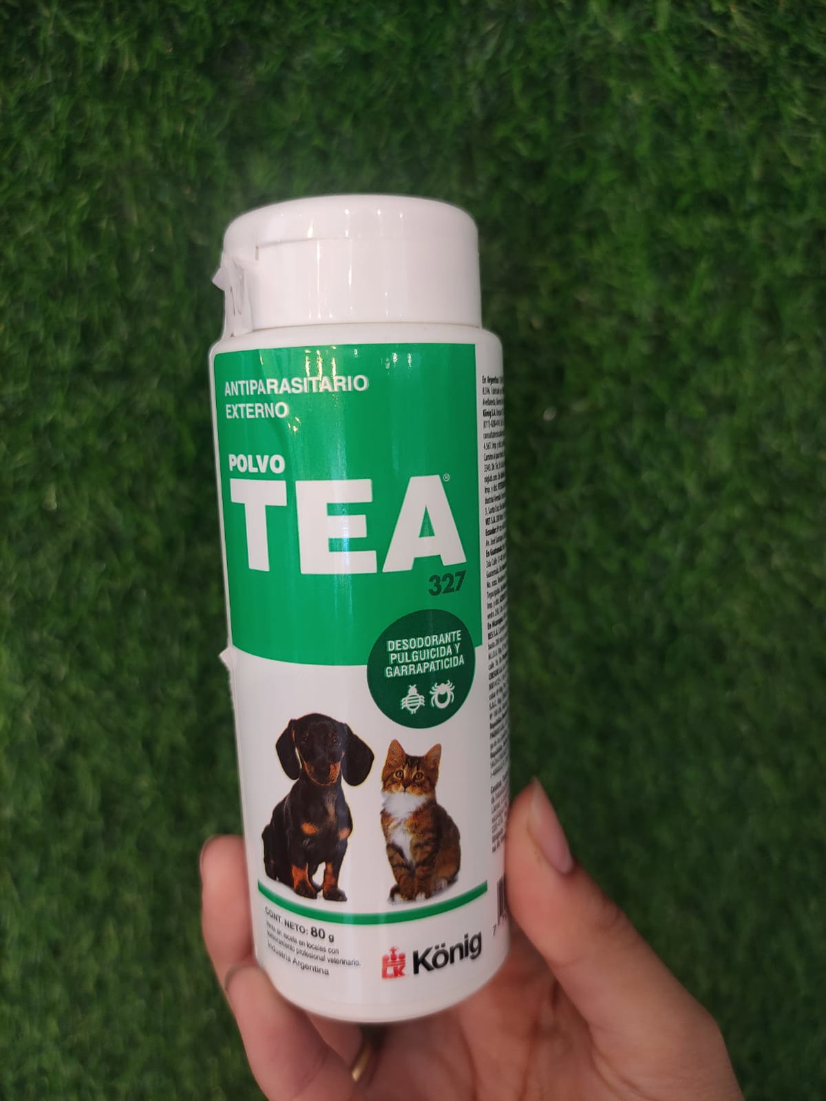 Polvo pulguicida, garrapaticida y desodorante para perros y gatos, ideal para usar entre baños.