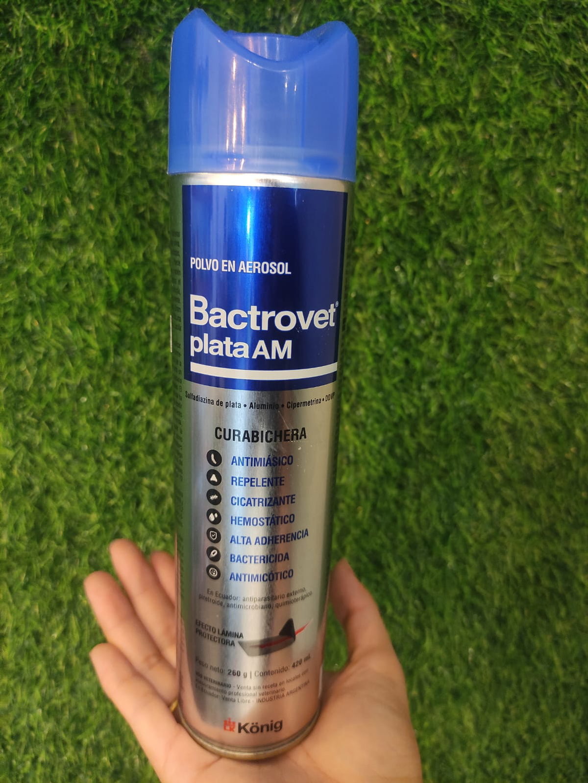 Curabichera Bactrovet Plata en aerosol y con film protector. Su potente efecto es eficaz y actúa como cicatrizante, antimiasico, repelente, antimicrobiano, epitelizador y hemostático de alta adherencia de uso tópico.