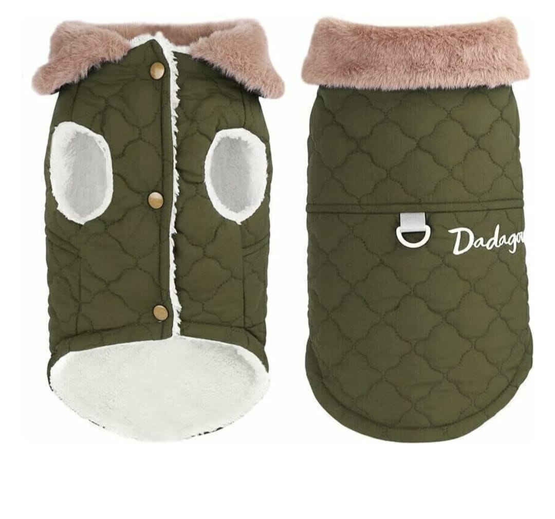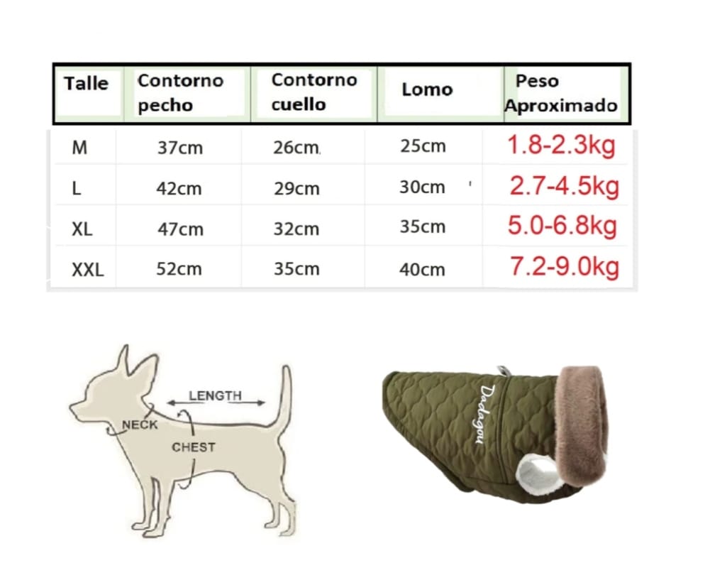 La chaqueta perfecta para mantener a tu peludo abrigado y cómodo en esta época de frio, combinando estilo y funcionalidad. Su material de piel interno proporciona una textura suave y agradable al tacto, asegurando que tu perro se sienta bien mientras la lleva puesta.