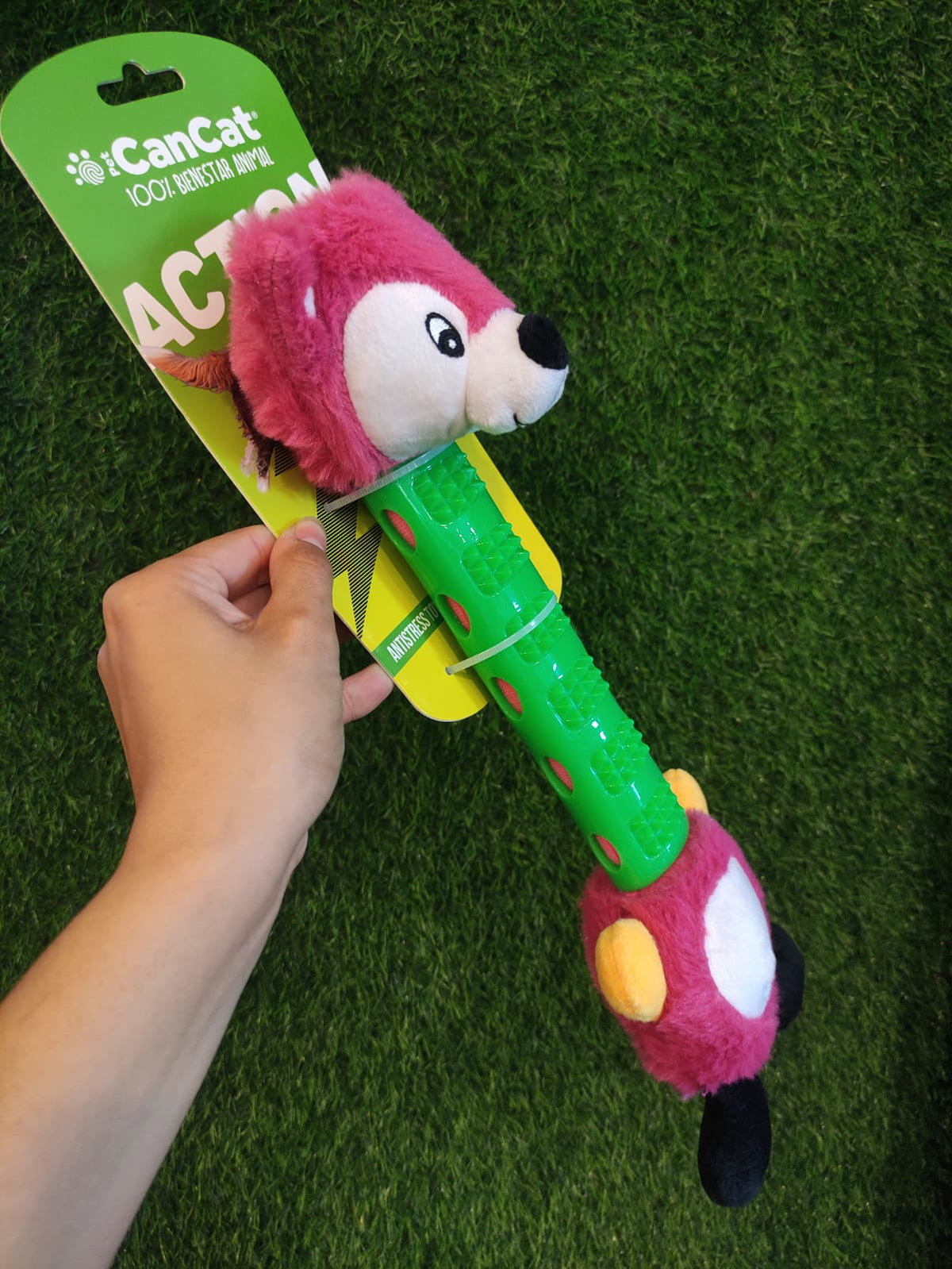 Este juguete forma parte de la linea de juguetes antiestres de CANCAT. Su cuerpo esta confeccionado en peluche y su largo cuello en caucho termoplastico, lo que garantiza mayor satisfaccion en la mordida. Gracias a la suavidad de estos materiales no dañara en absoluto los dientes de tu mascota. Tiene chifle y un diseño muy llamativo, lo que lo convierte en un divertido y atractivo juguete.