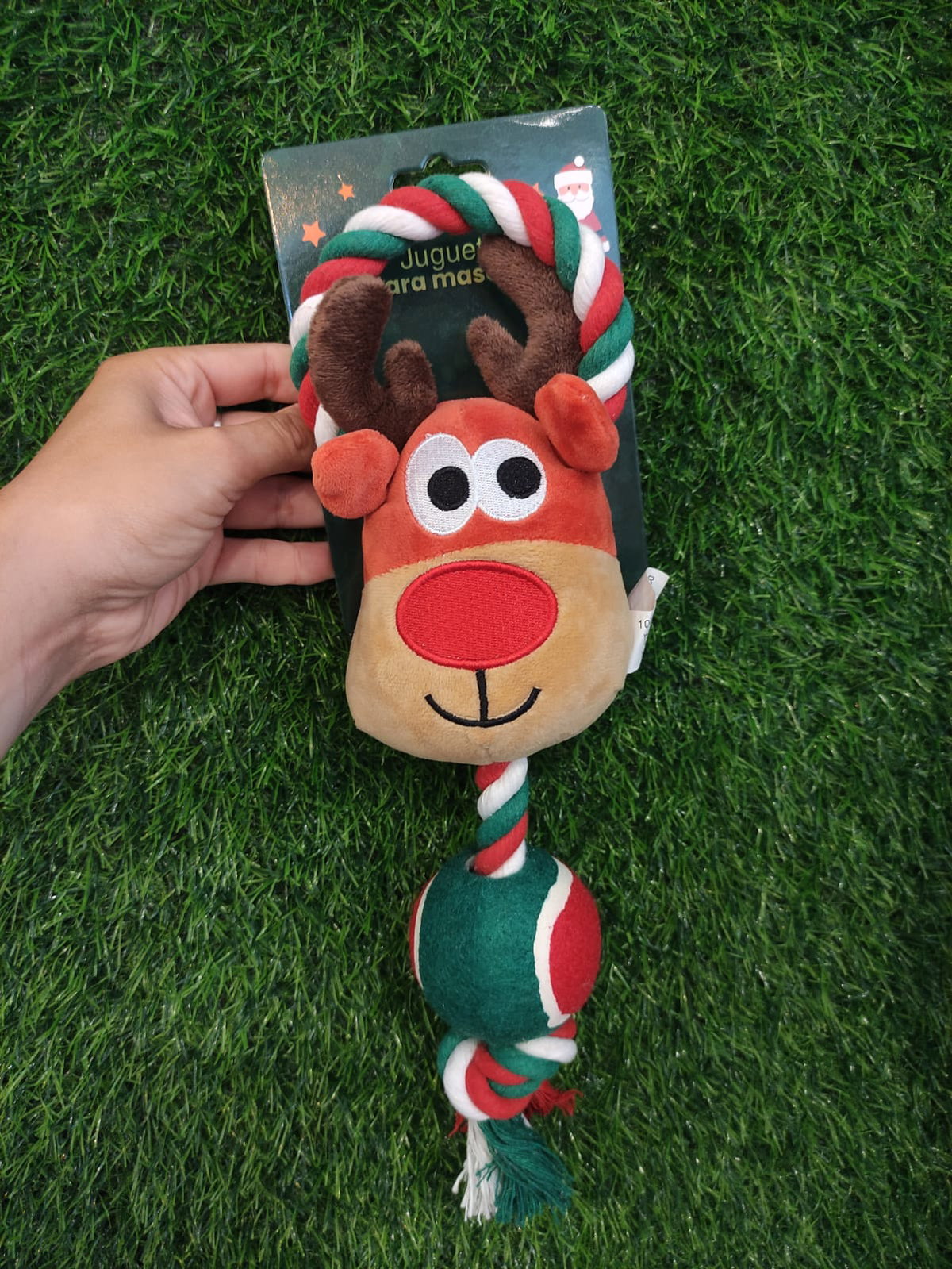 El peluche reno con pelota combina una pelota y una cuerda unidas a un adorable diseño navideño de reno, crando la mezcla perfecta entre ternura y diversion para tu peludito. Ideal para jugar, morder y entretenerse mientras disfruta del espiritu navideño.