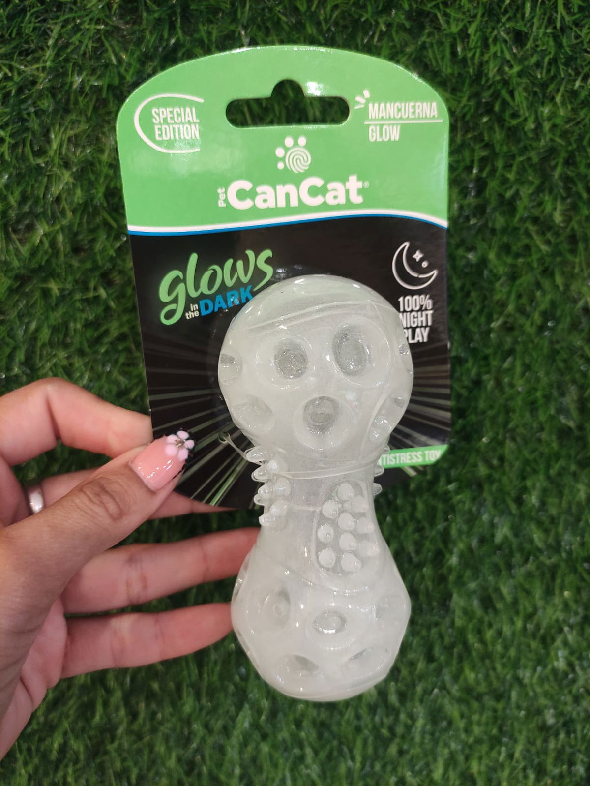 La línea GLOW IN THE DARK fue diseñada para que tu mascota libere stress mientras juega sin que la oscuridad se vuelva un impedimento. Son juguetes que brillan en la oscuridad. Se carga con la luz del día, aproximadamente durante 2 horas, para lograr su brillo máximo. Estos juguetes motivan su ingenio.