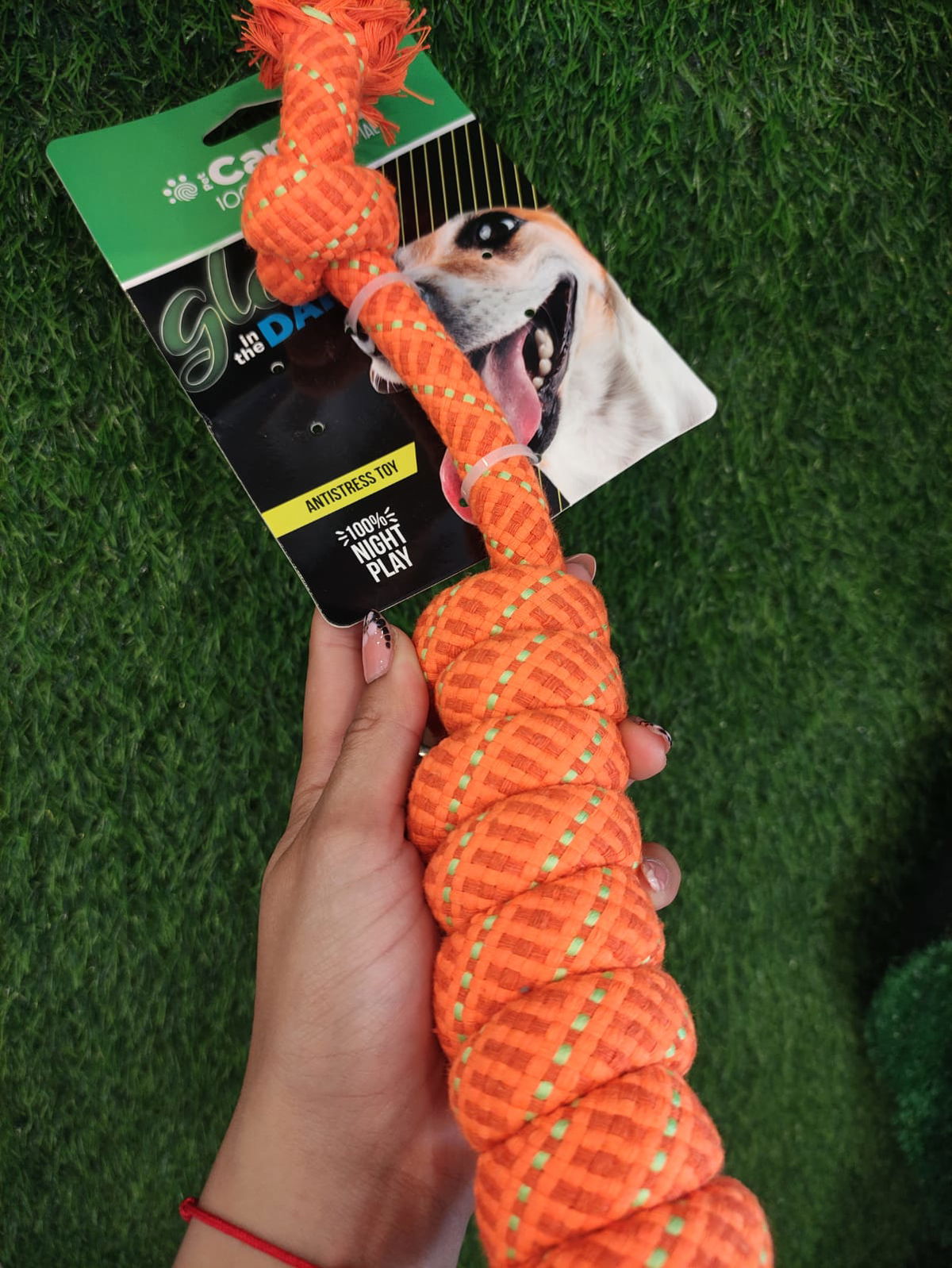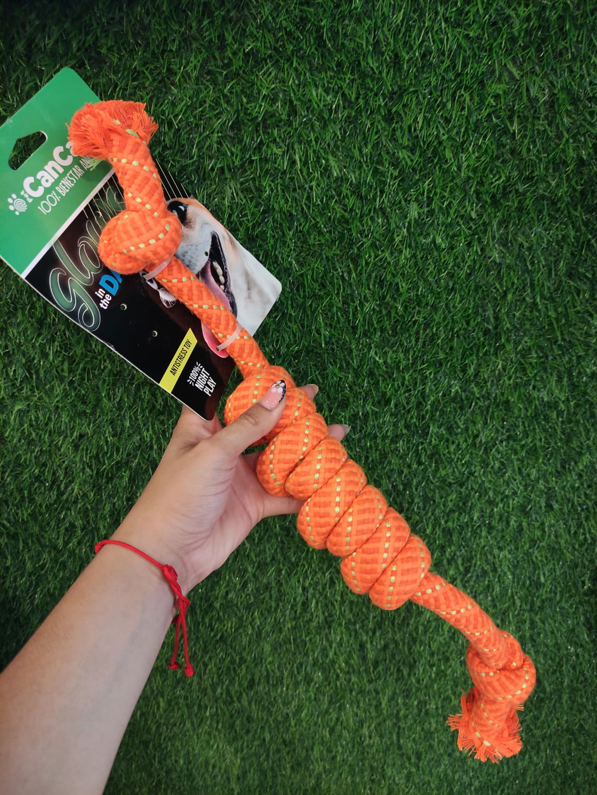 La soga luminosa CanCat es un juguete y accesorio para perros que brilla en la oscuridad, ideal para juegos nocturnos y paseos, fabricada con materiales resistentes como algodon y caucho, que ayuda a reducir el estres y cuidar la salud dental de tu mascota.